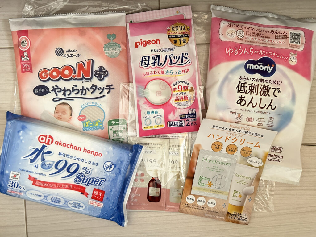 おむつの試供品、哺乳瓶の洗浄液、赤ちゃんの肌に使うクリーム、割引クーポン、ポイントアップ還元クーポンなど。
